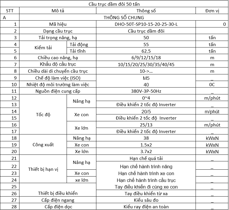 - Cầu trục dầm đôi 50 tấn 2 tốc độ tiêu thương hiệu châu âu